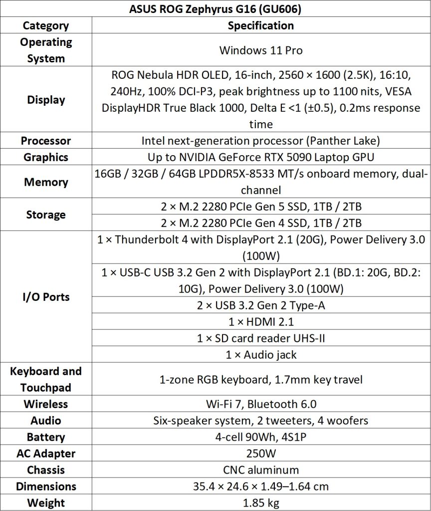 The Zephyrus G16 targets higher performance while maintaining portability. It is powered by Intel Core Ultra Series 3 processors with up to 50 TOPS of NPU performance, paired with up to an NVIDIA GeForce RTX 5090 Laptop GPU.