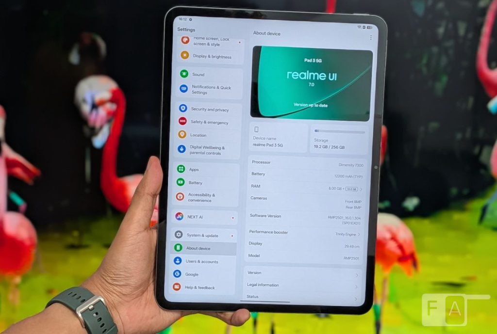 The tablet runs Android 16 with realme UI 7.0 on top, and has several AI features such as AI Documents, AI Recording Summary and Circle to Search.