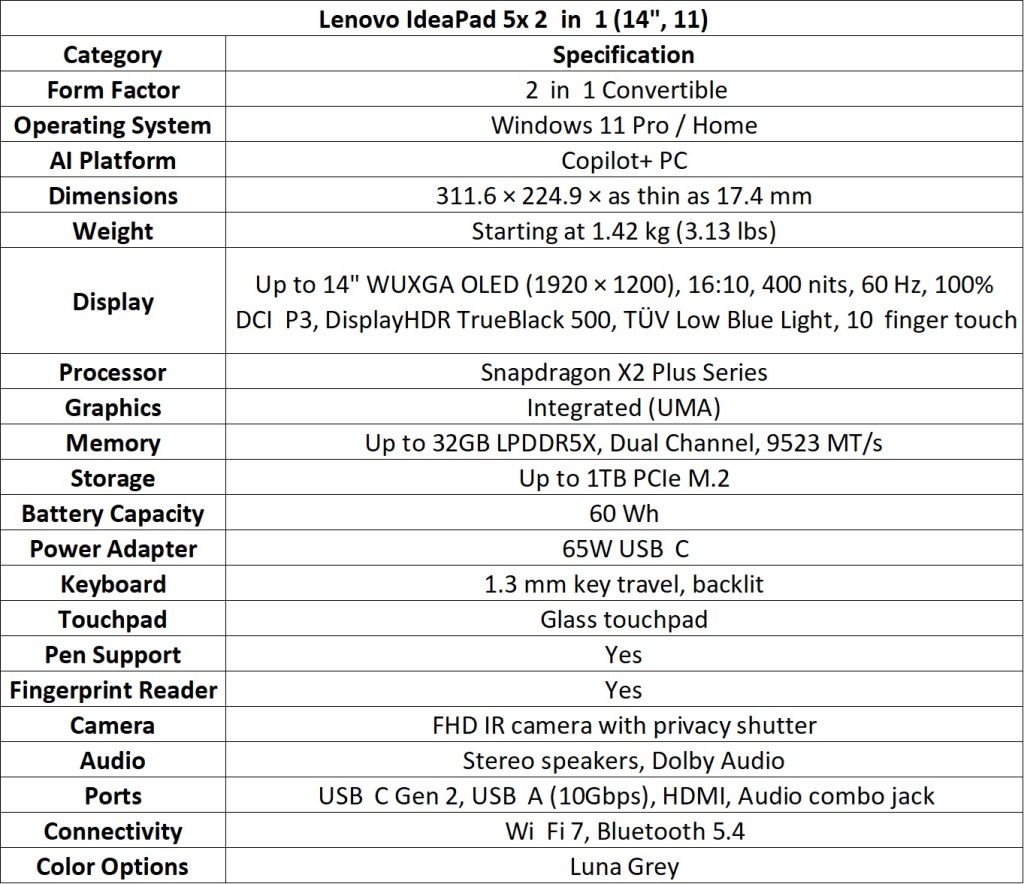 The IdeaPad 5x 2-in-1 (14”, 11) includes Snapdragon X2 Plus processors and Lenovo Linear Pen 2 (AES 3.0) with tilt and pressure sensitivity. It supports dual RAM/SSD slots for expansion.