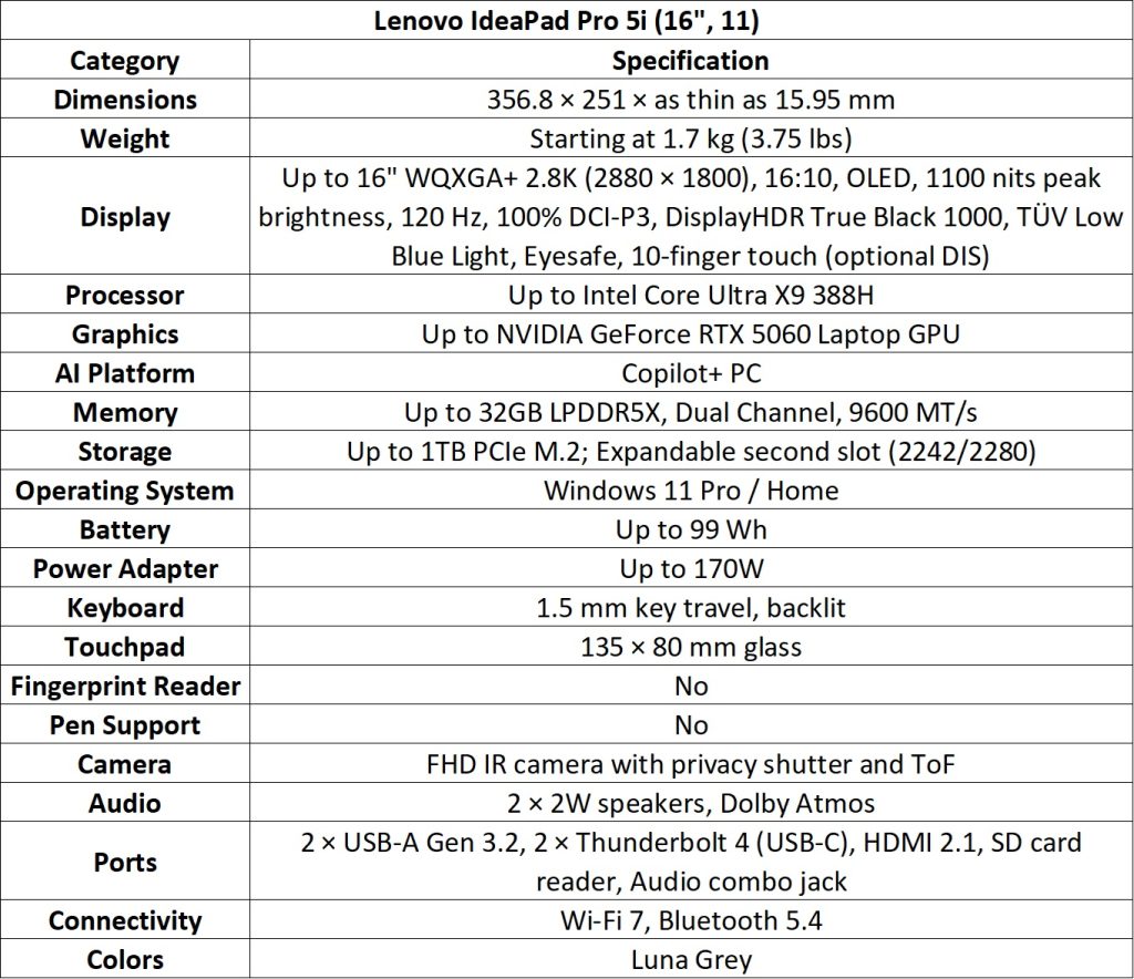 The IdeaPad Pro 5i (16”, 11) is powered by Intel Core Ultra X9 Series 3 processors and NVIDIA GeForce RTX 5060 Laptop GPU. It has a 2.8K OLED display covering 100% DCI-P3 color space and up to 99 Wh battery with Rapid Charge. An additional SSD slot allows storage expansion.