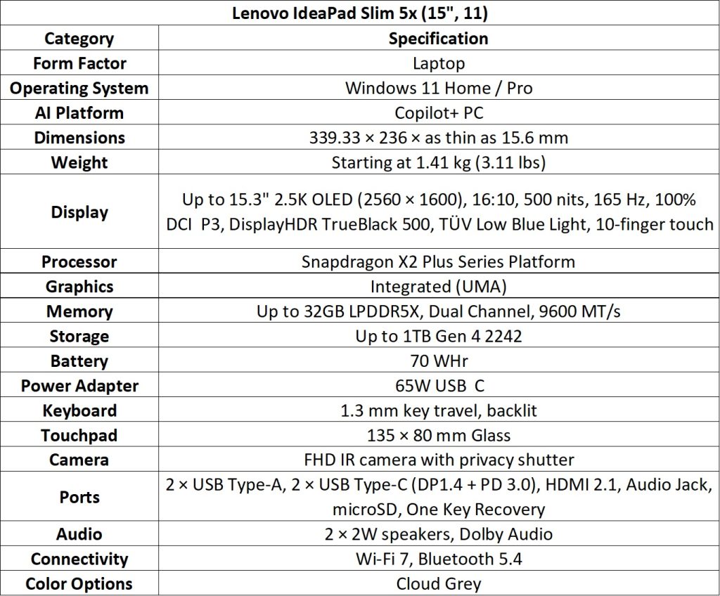 The IdeaPad Slim 5x (13” & 15”, 11) offers a thin-and-light design with Snapdragon X2 Plus efficiency, up to 21 hours battery life, Rapid Charge Boost, and up to 2.5K OLED display on the 15-inch model.