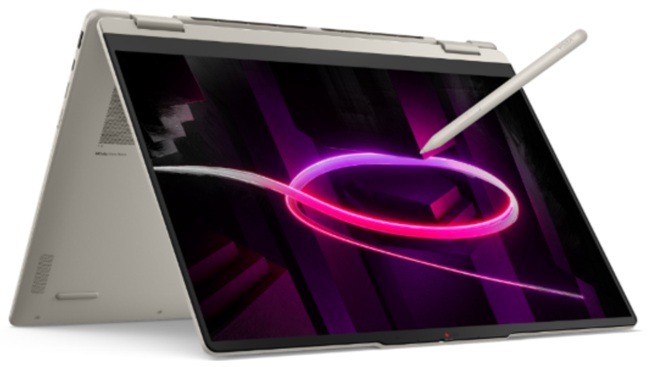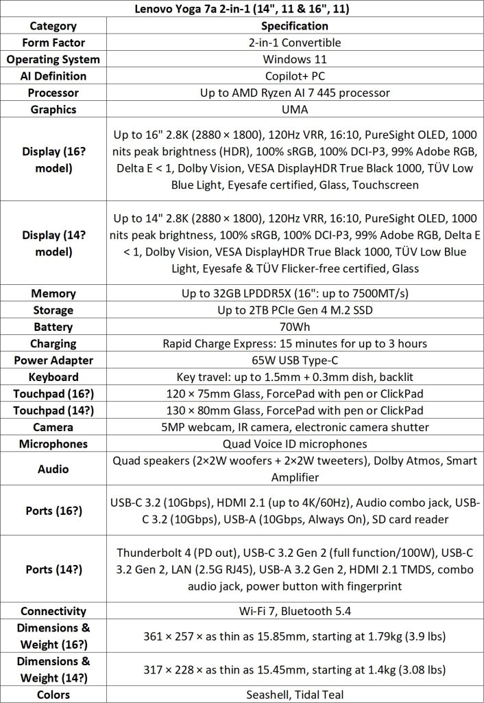 The Yoga 7a 2-in-1 offers 14- and 16-inch variants with a 360° hinge and Canvas mode for sketching and note-taking. It is powered by AMD Ryzen AI 400 Series processors. The Yoga Tote Sleeve serves as both a carrying solution and a stand for ergonomic use.