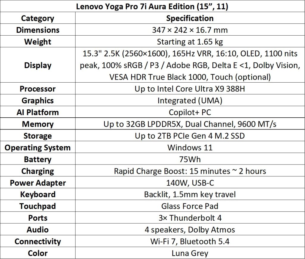 The Yoga Pro 7i Aura Edition (15”, 11) includes Intel Core Ultra 9 Series 3 processors and NVIDIA GeForce RTX 5070 GPU (105 W TDP). The 2.5K PureSight Pro OLED display provides 1100 nits peak brightness and VESA HDR True Black 1000 certification. Connectivity options include dual Thunderbolt™ 4 ports, HDMI 2.1, USB-A Gen 2, and SD card reader. An optional Force Pad with Yoga Pen Gen 2 is supported for creative tasks.