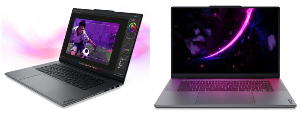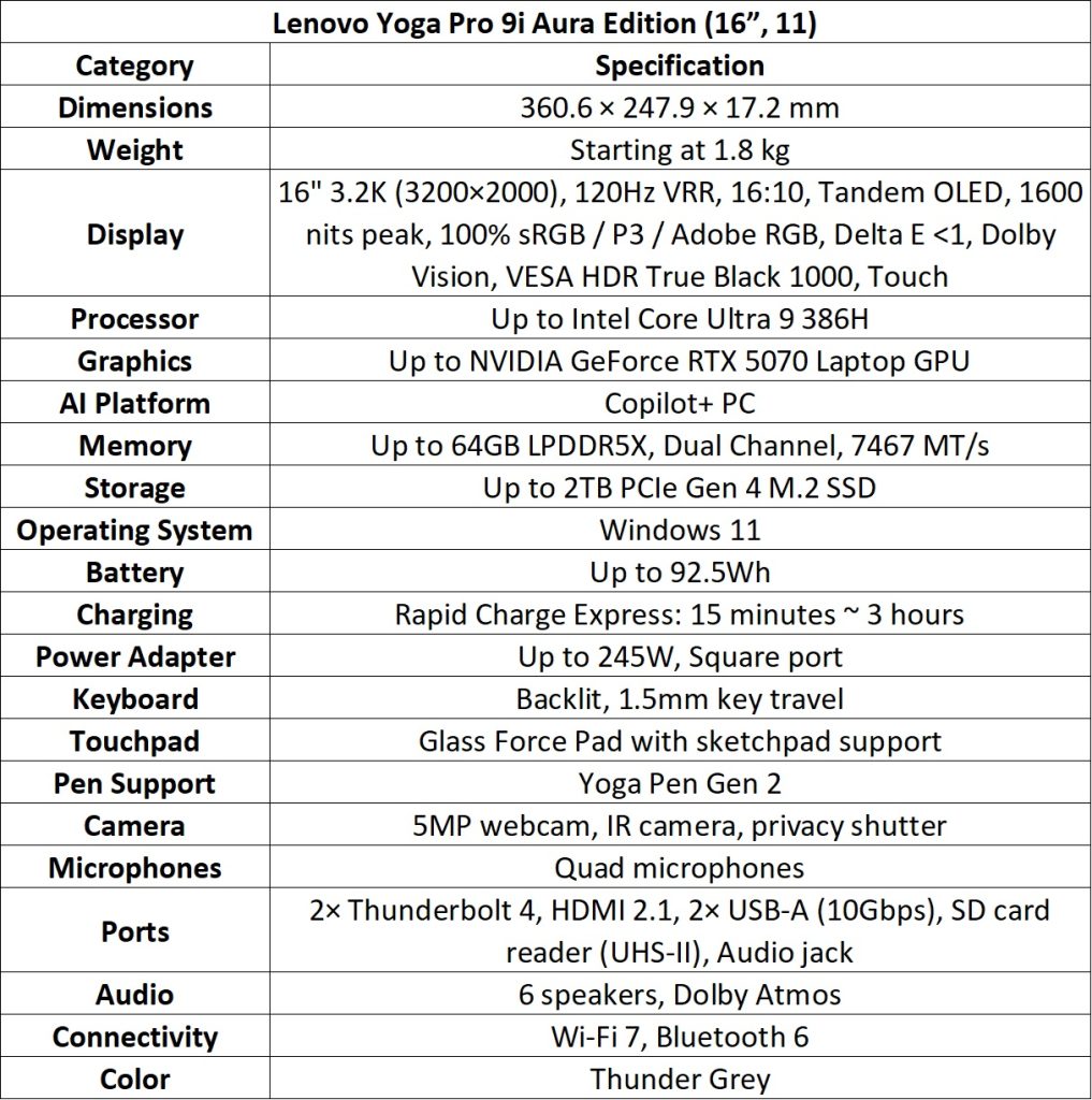 The Yoga Pro 9i Aura Edition (16”, 11) features Intel Core Ultra 9 Series 3 processors and NVIDIA GeForce RTX 5070 Laptop GPU. Its 3.2K PureSight Pro Tandem OLED display covers 100% Adobe RGB, P3, and sRGB, with 1600 nits peak brightness and VESA HDR True Black 1000 certification.