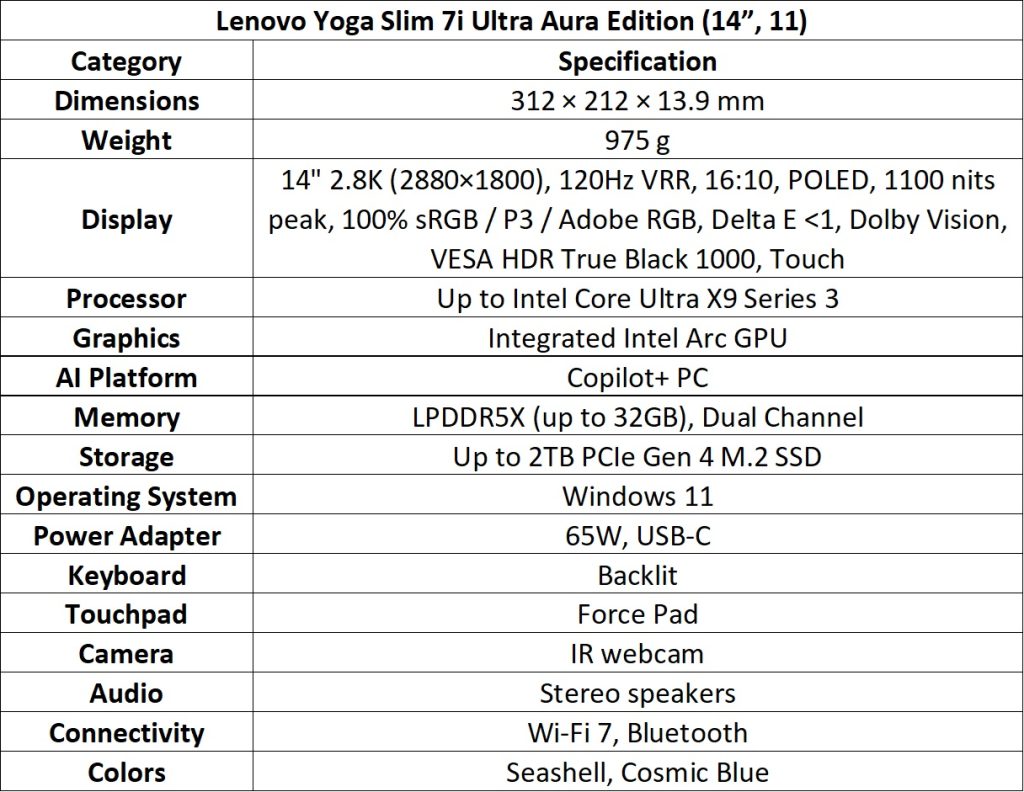 The Yoga Slim 7i Ultra Aura Edition (14”, 11) combines Intel Core Ultra X9 Series 3 processors with Intel Arc GPU and high-speed 9600MHz RAM. Its 2.8K PureSight Pro POLED display offers 1100 nits peak brightness and VESA HDR True Black 1000. The magnesium alloy chassis and Force Pad provide lightweight durability.