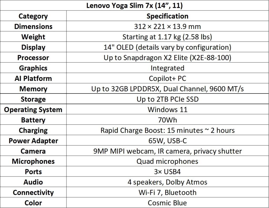 The Yoga Slim 7x (14”, 11) uses Snapdragon® X2 Elite or X2 Plus processors with a 2.8K PureSight Pro OLED display and 1100 nits peak brightness. It supports up to 29 hours of battery life, weighs 1.17 kg, and measures 13.9 mm thick, with a 9MP MIPI IR webcam.