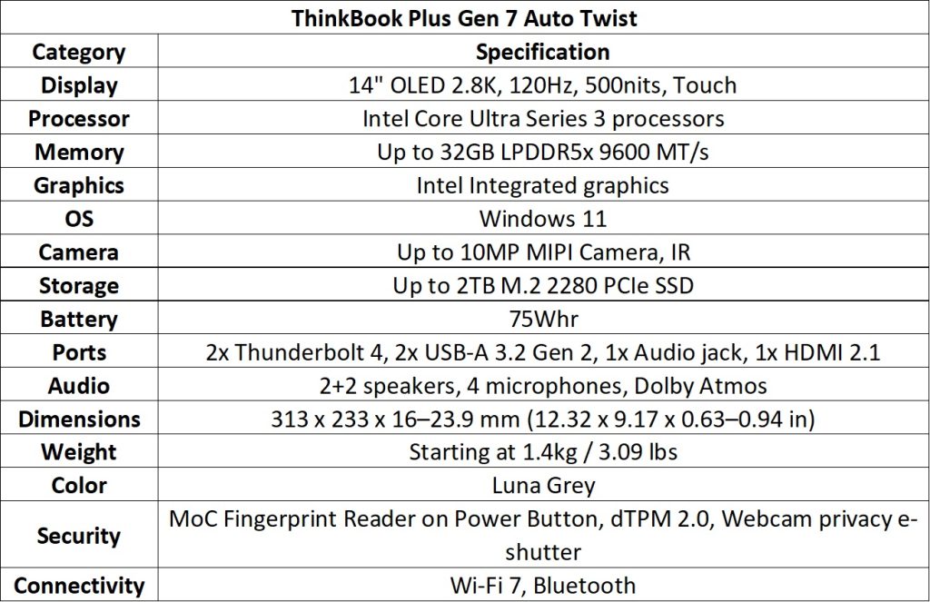 The ThinkBook Plus Gen 7 Auto Twist introduces a motorized dual-rotation hinge that adjusts the display automatically based on posture, mode, or presentation angle. It features a 14-inch 2.8K OLED display, 120Hz refresh, 500 nits brightness, and Dolby Vision support. Front-facing Dolby Atmos speakers rotate with the display for consistent audio.