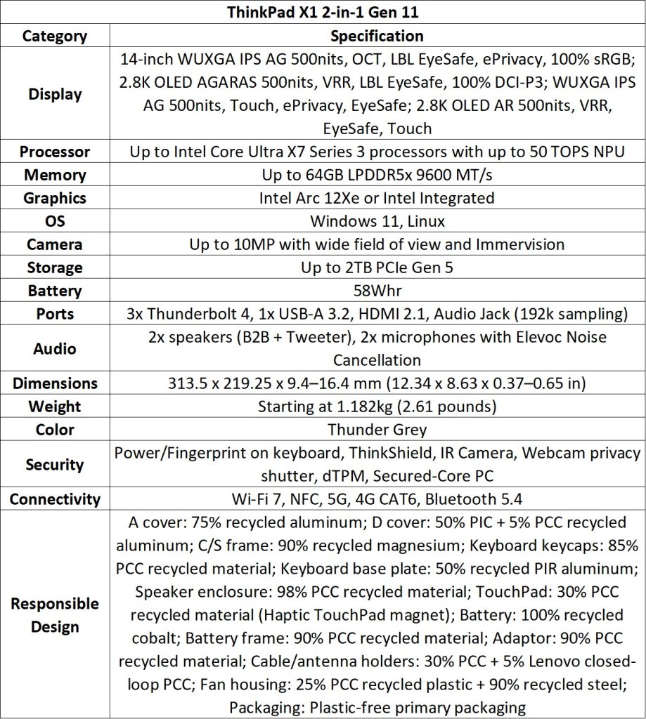 The ThinkPad X1 2-in-1 Gen 11 Aura Edition shares the Space Frame design and performance specifications of the X1 Carbon, including Intel Core Ultra X7 Series 3 processors, Intel Arc GPU, LPDDR5x memory, and a 10MP wide-field camera.