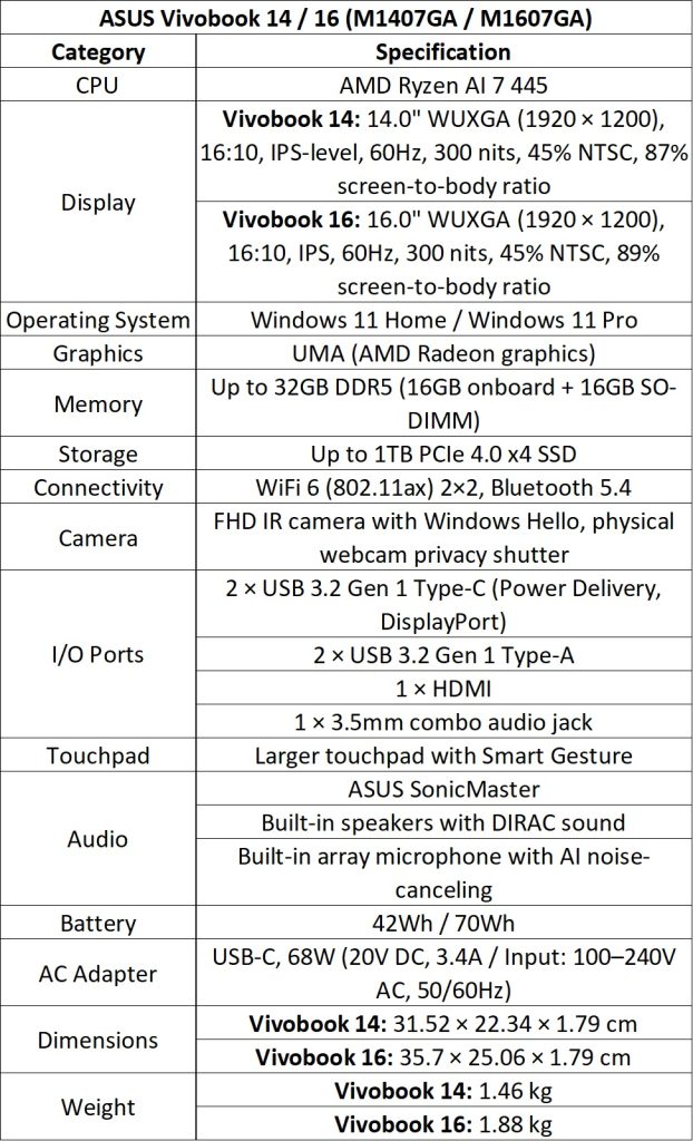 Vivobook 14 (M1407GA/X1407AA), 16 (M1607GA/X1607AA), and 18 (M1807GA) laptops feature AMD Ryzen AI 7 445 or Intel Core Ultra 7 Series 3 processors, with up to 50 TOPS (AMD) or 49 TOPS (Intel) NPU.