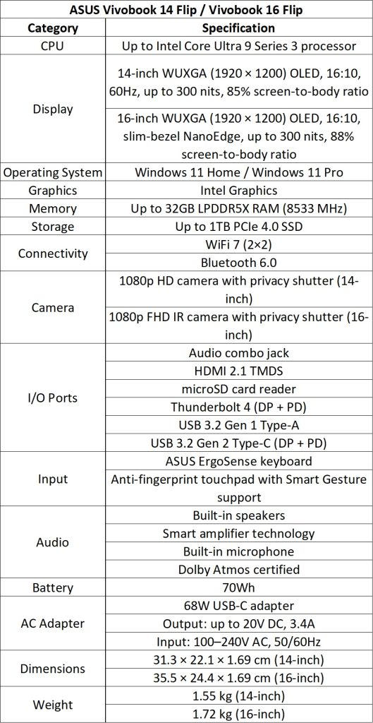 The Vivobook 14 Flip (TP3407AA) and 16 Flip (TP3607AA) are 360° convertible laptops. Both models feature Intel Core Ultra 9 Series 3 processors with up to 50 TOPS NPU and up to 32GB LPDDR5X RAM. They include up to 1TB SSD storage for high-speed file access.