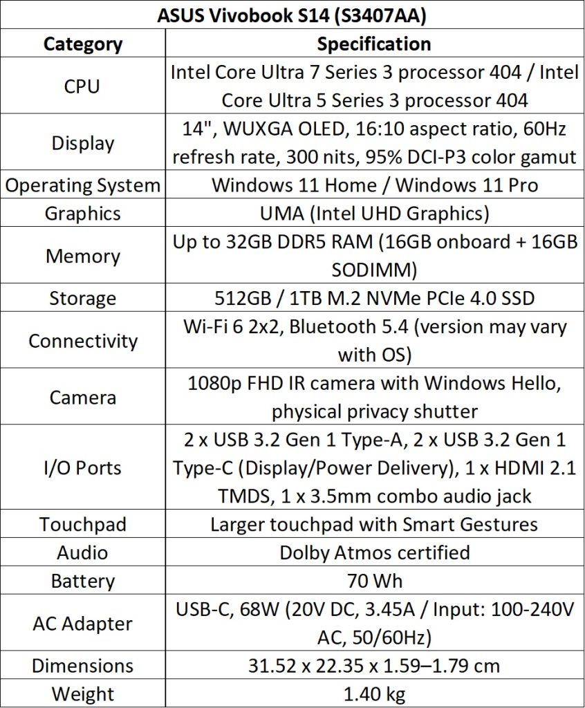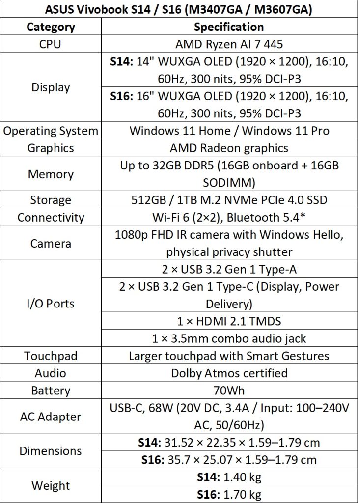 The Vivobook S14 and S16 (S3407AA/S3607AA for Intel; M3407GA/M3607GA for AMD) are ultra-slim laptops with up to Intel Core Ultra 9 Series 3 or AMD Ryzen AI 7 445 processors and up to 50 TOPS NPU.