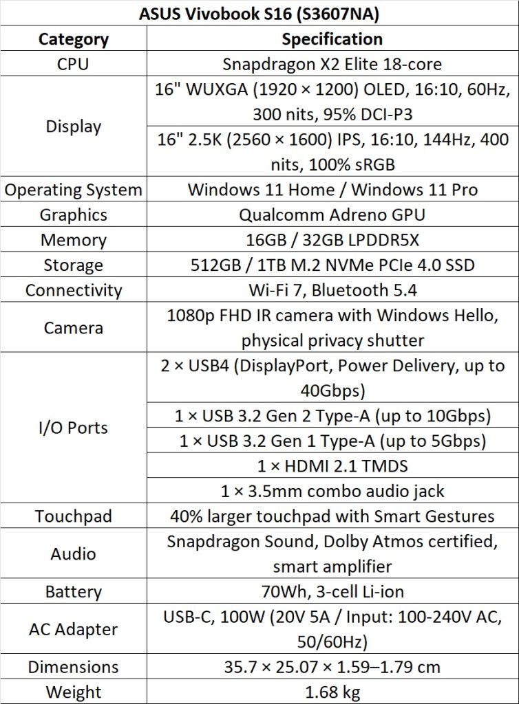 The Vivobook S16 (S3607NA) variant with Snapdragon X2 Elite features an 18-core CPU, 80 TOPS NPU, and pro-level GPU performance in a 1.68kg chassis. Its 16:10 WUXGA OLED display / 16″ 2.5K 144Hz display and Snapdragon Sound technology support all-day work, study, or entertainment.