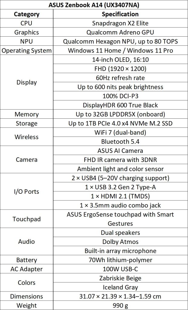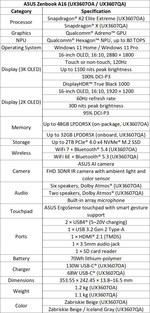 Zenbook A16 (UX3607) and A14 (UX3407) are powered by Snapdragon X2 Elite processors with 18 cores, pro-level GPUs, and 80 TOPS NPU. A16 has a 16-inch 3K OLED display at 1.2kg, and A14 has a 14-inch FHD OLED at 990g.