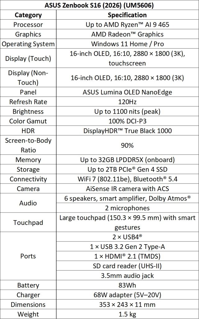 Zenbook S16 (UM5606, AMD) and S14 (UX5406, Intel) are premium ultrathin laptops. The S16 is powered by AMD Ryzen AI 400 Series with 50 TOPS NPU, and the S14 by Intel Core Ultra Series 3 with up to 50 TOPS NPU.