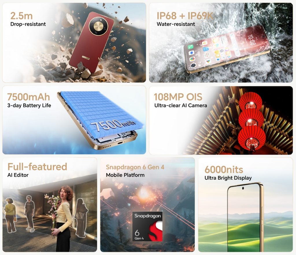 The device is powered by the Snapdragon 6 Gen 4 (4nm) mobile platform and uses HONOR’s VC Ice Cooling System with a 3,490mm² stainless steel vapour chamber and a total cooling area of 29,500mm². It packs a 7500mAh silicon-carbon battery, supports 66W HONOR SuperCharge, reverse charging, and operation between –30°C and 55°C.