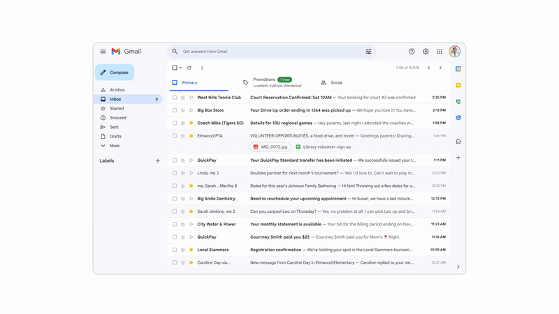 Gmail now provides AI Overviews that summarize lengthy email threads into essential points, and users can ask questions in natural language—like “Who provided a quote for my bathroom renovation last year?”—with Gemini retrieving the relevant details from their emails.