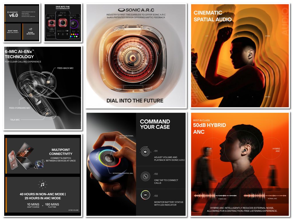 The earbuds support multipoint connectivity for switching between two devices and feature in-ear detection to pause or resume playback automatically. Using the boAt Hearables App v2.0, users can set preset and custom EQs, customize LED colors and patterns, remap controls for the earbuds and the rotational crown, manage ANC modes, monitor battery levels, and receive over-the-air updates.