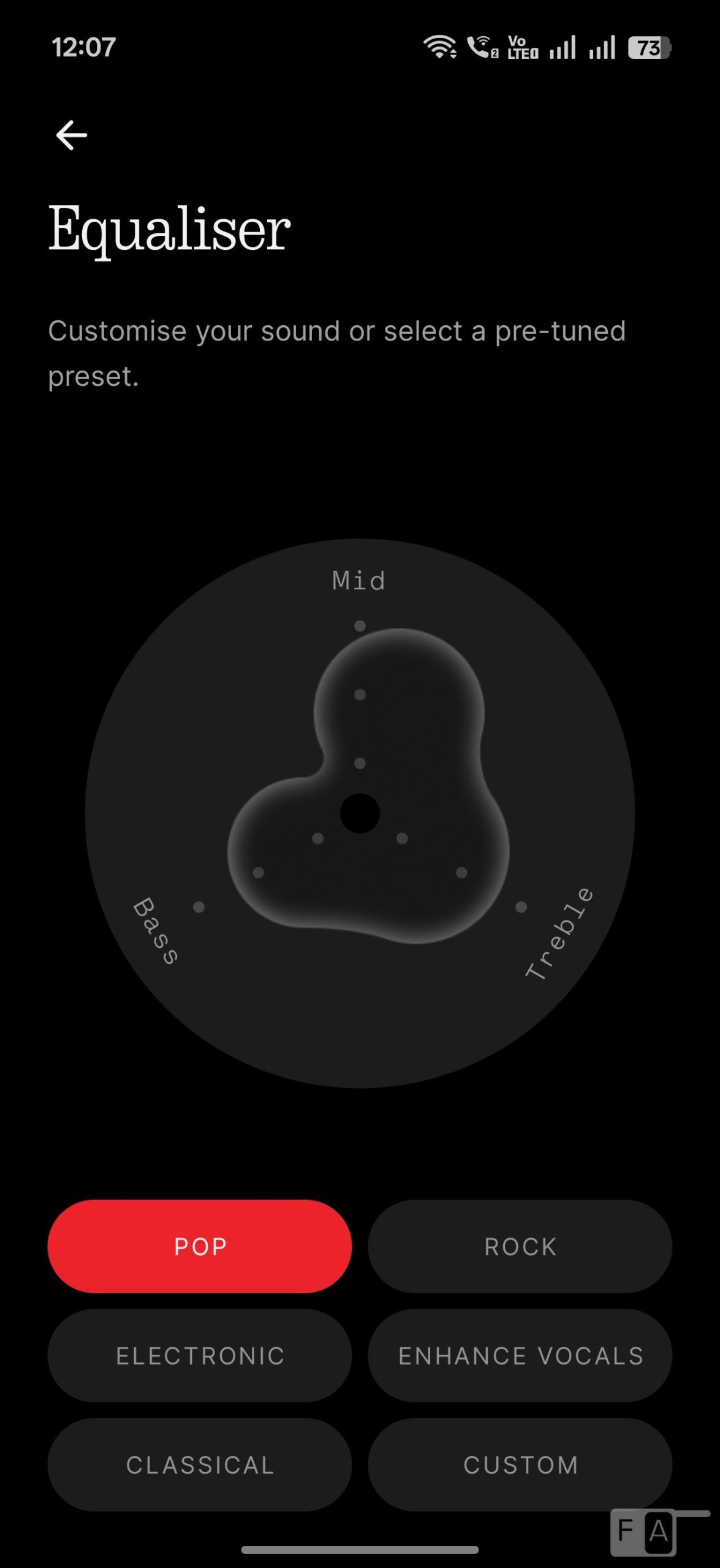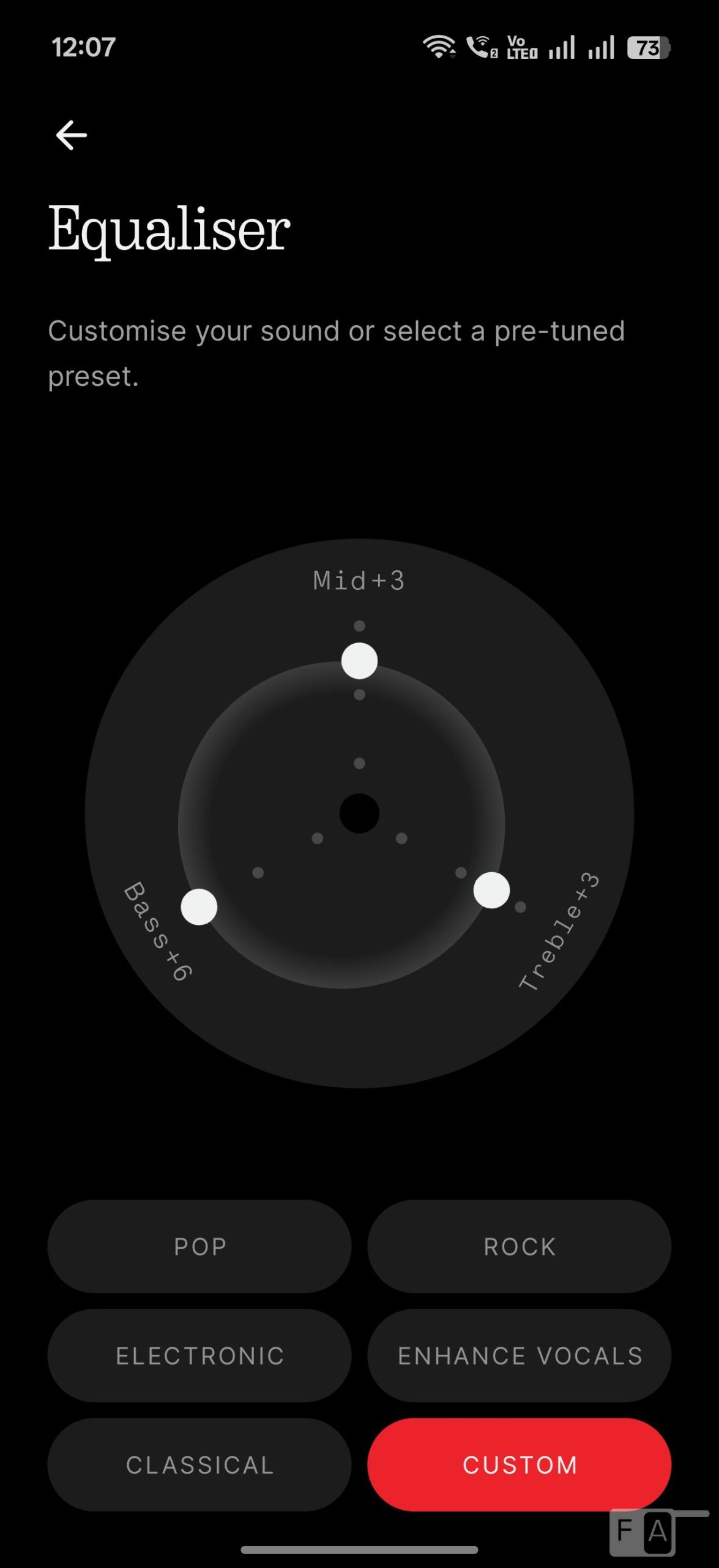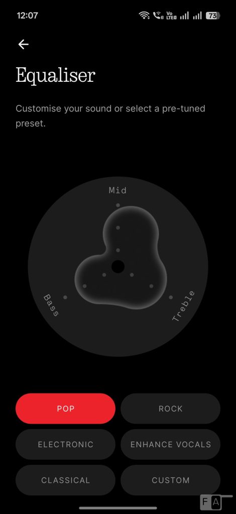 It features four equalizer presets – Pop, Rock, Electronic, Enhance Vocals, and Classic – so that every song can be heard how it should. There is equalizer customization that lets you adjust bass, treble and mids, but you don’t get 8-band Equalizer customization that is available on Nothing Headphone (1).