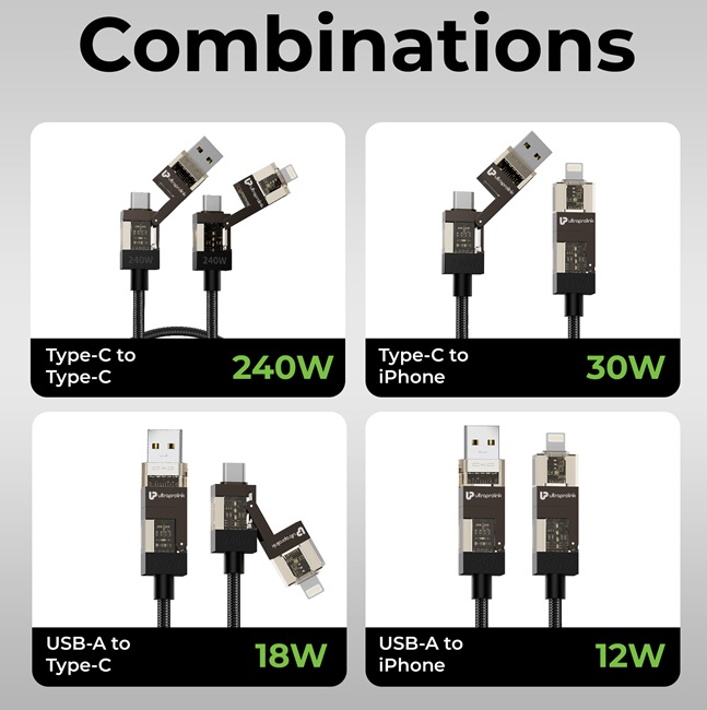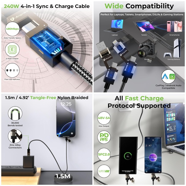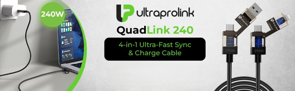 UltraProlink has introduced QuadLink 240, a 4-in-1 USB data and charging cable intended to support multiple devices through a single cable. It is designed for use with smartphones, tablets, laptops, cameras, gaming devices, and accessories that require different connectors and power levels, reducing the need to carry separate cables across devices.