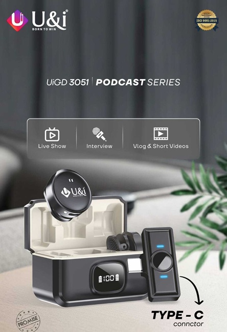 The UiGD 3051 is compatible with smartphones and USB-C devices through a Type-C receiver. The LED display on the charging case indicates battery status. The clip-on transmitter supports live streaming, vlogging, and interviews. The carry case can charge both the microphone and receiver simultaneously.