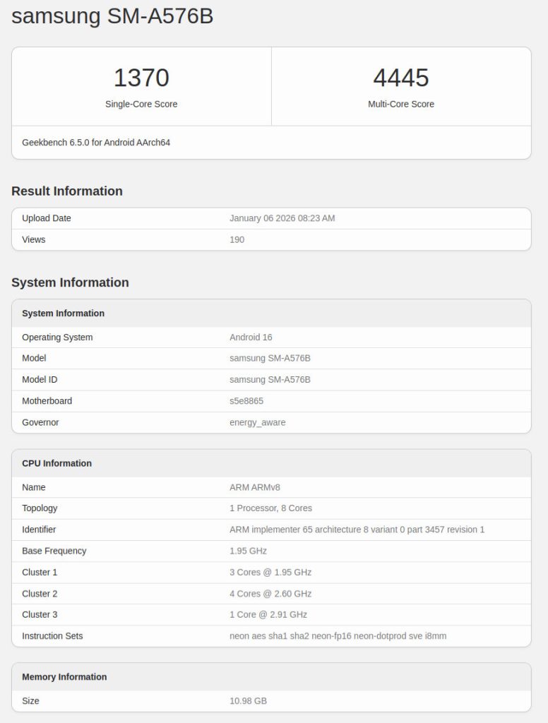 Samsung Galaxy A57 smartphone with the model number SM-A5760 has been certified by MIIT in China revealing the complete specifications of the phone ahead of launch.