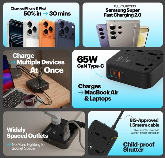 Safety features include child-proof shutters, a fire-retardant outer body, and an intelligent control circuit that protects devices from over-current, over-power, and short circuits. It comes with a BIS-approved 1.5-metre heavy-duty cable and is manufactured in India.