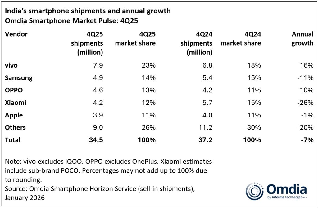 vivo retained its lead with 7.9 million units shipped (23% market share) in 4Q25, maintaining top position for the full year. Samsung followed with 4.9 million units (14% share). OPPO (excluding OnePlus) overtook Xiaomi for third place with 4.6 million units (13% share), while Xiaomi and Apple shipped 4.2 million and 3.9 million units, respectively.