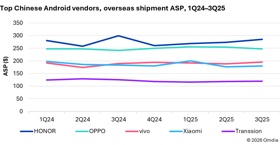 HONOR has prioritized the $300–499 price segment, representing about 23% of its overseas shipments in the first three quarters of 2025, the highest proportion among major Chinese vendors. This segment focus involves: