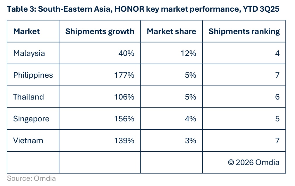 HONOR’s overseas business emerged as a major growth driver in 2025, driven by strong shipment gains, a focus on mid-to-high-end devices, and a regionally stratified expansion strategy. According to Omdia, the company’s international shipments grew approximately 55% year-on-year in 1Q–3Q 2025, the strongest growth among the top 10 global smartphone vendors.
