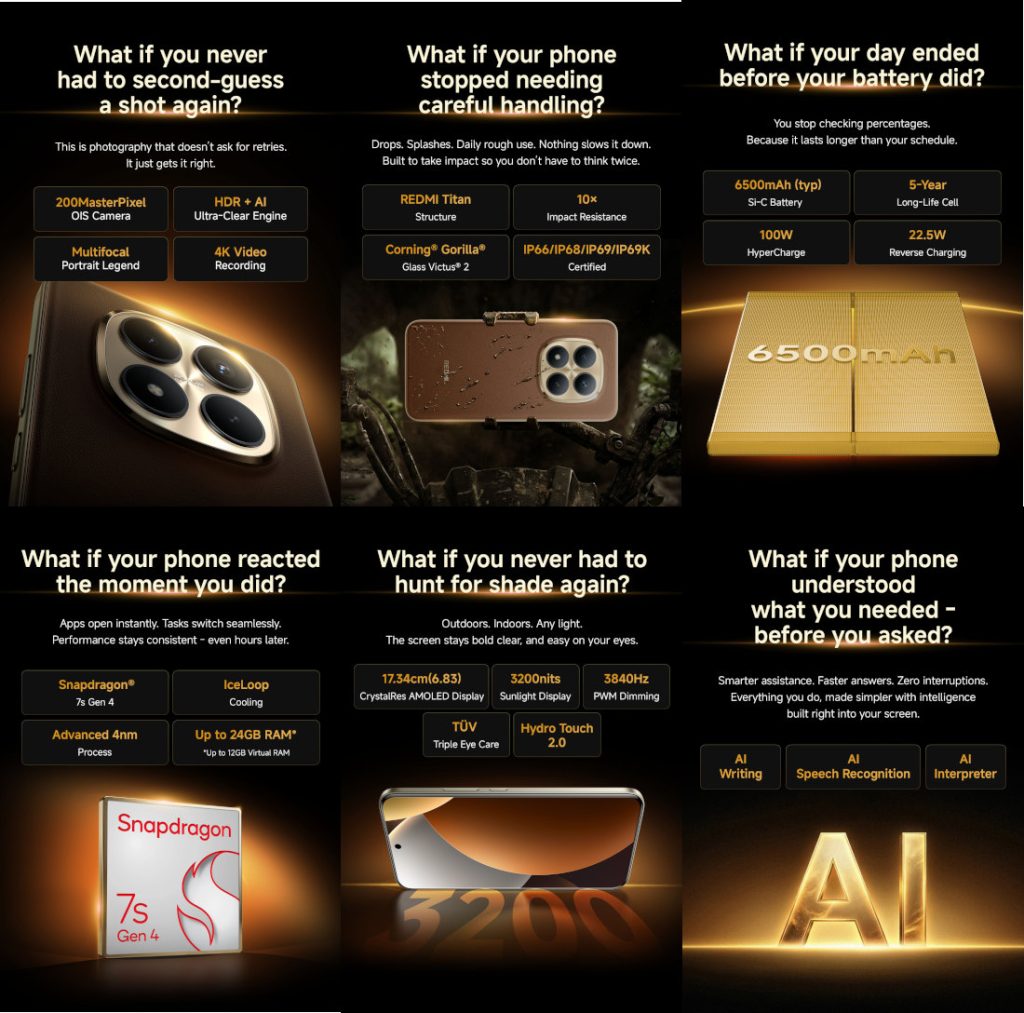The company highlights the REDMI Note 15 Pro+ with a 200MP rear camera, REDMI Titan structure, Corning Gorilla Glass 2 protection, IP66, IP68, IP69, and IP69K ratings for dust and water resistance, and a 6500mAh silicon-carbon battery with 100W fast charging and 22.5W reverse charging.