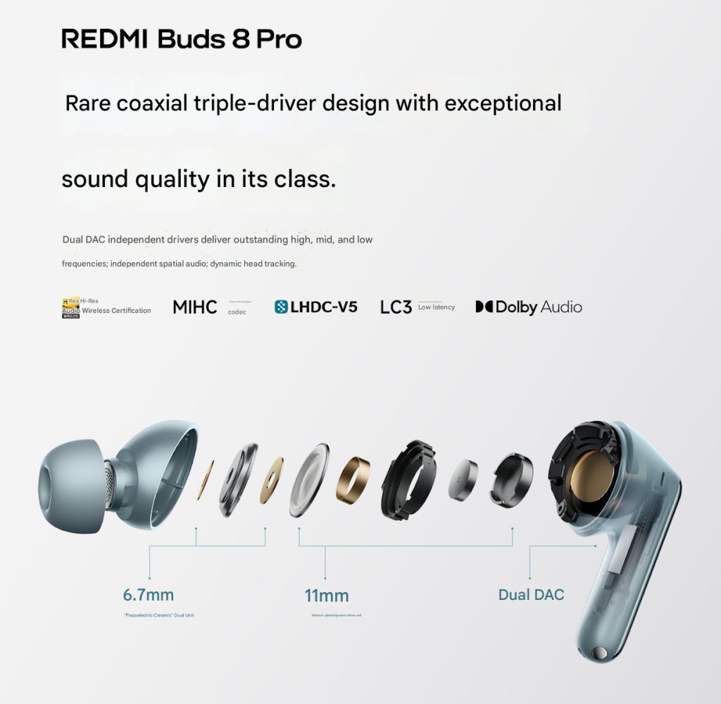 Xiaomi will also introduce the REDMI Buds 8 Pro with dual 6.7mm piezoelectric ceramic drivers and an 11mm titanium-plated dynamic driver, support Xiaomi’s self-developed MIHC codec, LHDC-V5, and Hi-Res wireless audio alongside.