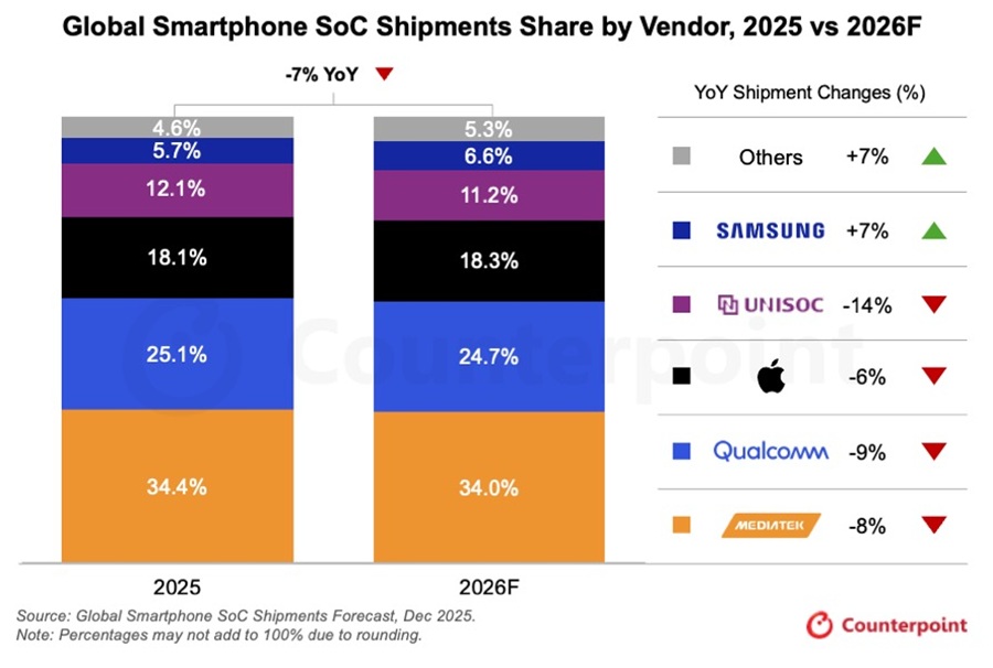 The global smartphone SoC (System-on-Chip) market is expected to slow in 2026, with shipments projected to decline 7% year-on-year (YoY), according to Counterpoint Research’s Global Smartphone SoC Model Shipments and Revenue Tracker, Q4 2025, Preliminary View. After several years of consistent growth, the industry faces challenges from rising memory costs and shifting market dynamics.