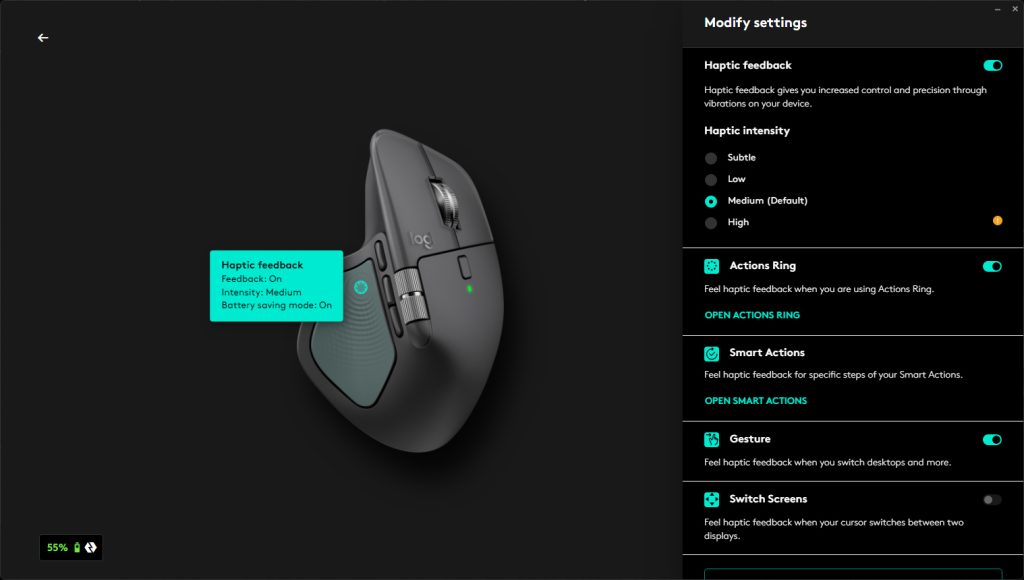 The haptic feedback is a bit of a mixed bag in my experience. On one hand, it adds a sense of tactility that makes certain interactions feel more deliberate. On the other hand, it isn’t a feature that alone justifies upgrading to the MX Master 4. I do appreciate having it, but I wouldn’t miss it too much if it were disabled. That said, this is largely because the mouse feels excellent in almost every other aspect.