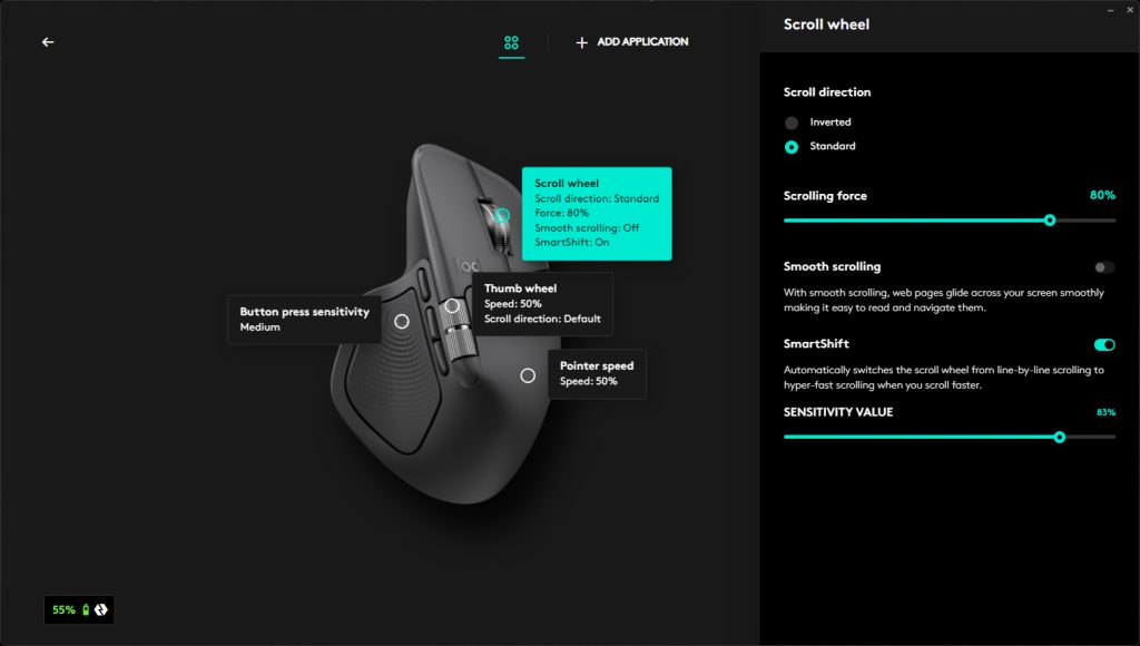 Even the scroll behaviour is highly customizable. Users can adjust the scrolling direction, fine-tune the force required to scroll, and tweak other scrolling parameters. One feature I continue to appreciate is SmartShift, which automatically switches the scroll wheel from precise, line-by-line scrolling to a free-spinning hyper-fast mode. Logitech also lets you control the threshold at which this switch occurs, adding yet another layer of personalization.