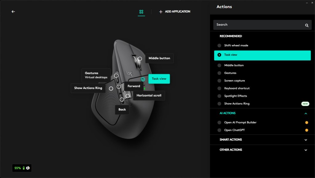 Customizability is where the MX Master 4 truly shows its strength as a professional productivity mouse. Every button can be customized both globally and on a per-application basis. These options range from simple actions such as play/pause, cut, copy, and paste, to more advanced functions like triggering macros, assigning custom keyboard shortcuts, and even accessing ChatGPT through the built-in AI Prompt Builder.