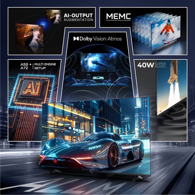 The 55-inch and 65-inch models carry the same feature set as the 43-inch 4K variant, with upgrades in audio output, storage, and connectivity. Both support MEMC, include 16GB internal storage, and increase audio output to 36W on the 55-inch model and 40W on the 65-inch model. All three sizes are powered by an A55 + A72 dual-core processor with integrated AI and ship with a Google Assistant-enabled remote.