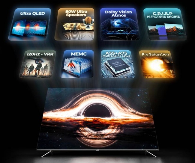 Audio output is rated at 80W using Dual Amplifier–Tweeter–Woofer speaker technology, with Dolby Atmos support. The TVs are powered by an A55 + A75 dual-core processor, include 16GB internal storage, and support MEMC, Auto Low Latency Mode (ALLM), and 120Hz Variable Refresh Rate (VRR).