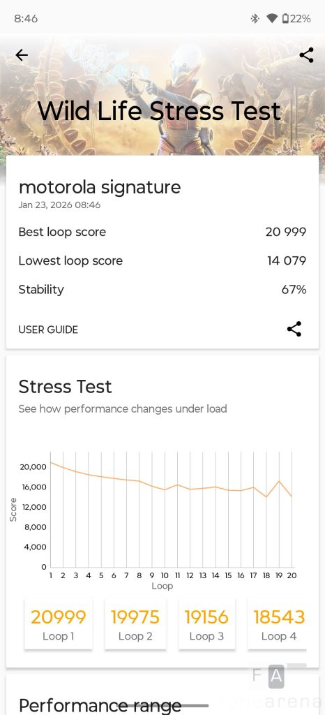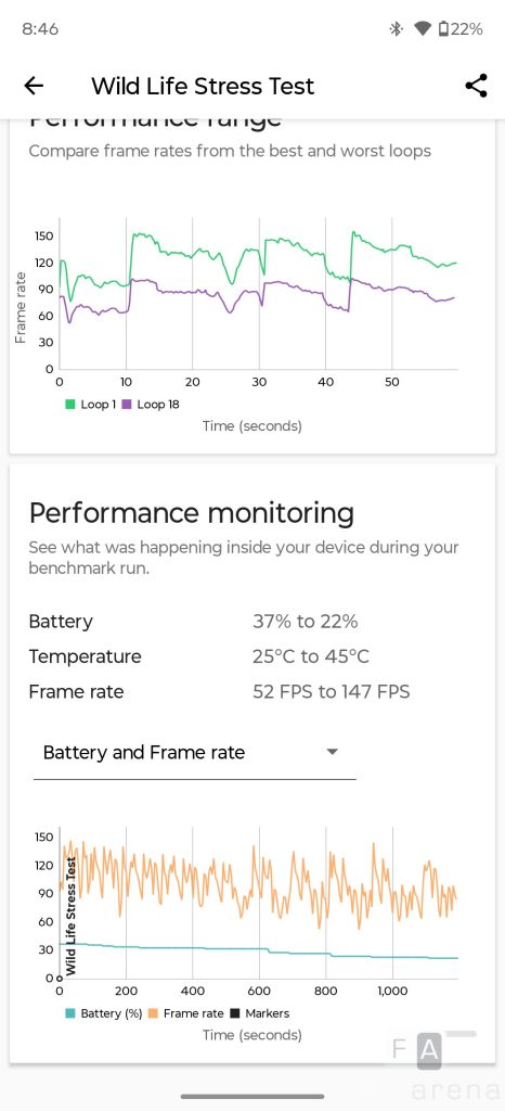 It supports 120fps in BGMI, but 165Hz doesn’t work in any games. In 3D Mark Wild Life stress test, it scored 67%, which is decent. The temperature shot up from 25 to 45 degrees, which is decent. Check out the benchmarks below.