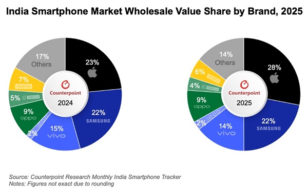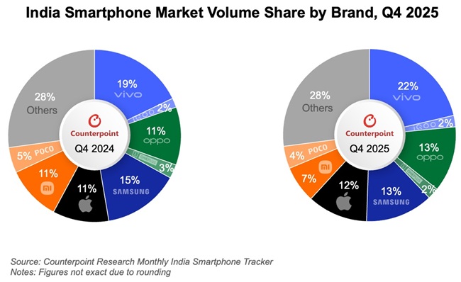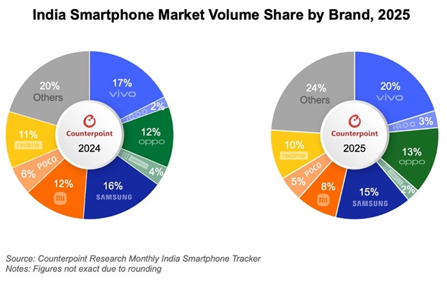vivo (excluding iQOO) led the Indian smartphone market in 2025 with a 20% volume share, according to Counterpoint. Senior Research Analyst Prachir Singh explained that vivo followed a dual approach across mass-market and higher-priced segments. The Y and T series contributed to volume shipments, while the X series grew 185% YoY, supported by the ZEISS camera partnership and the introduction of the X200 FE, positioned between the V series and flagship models.