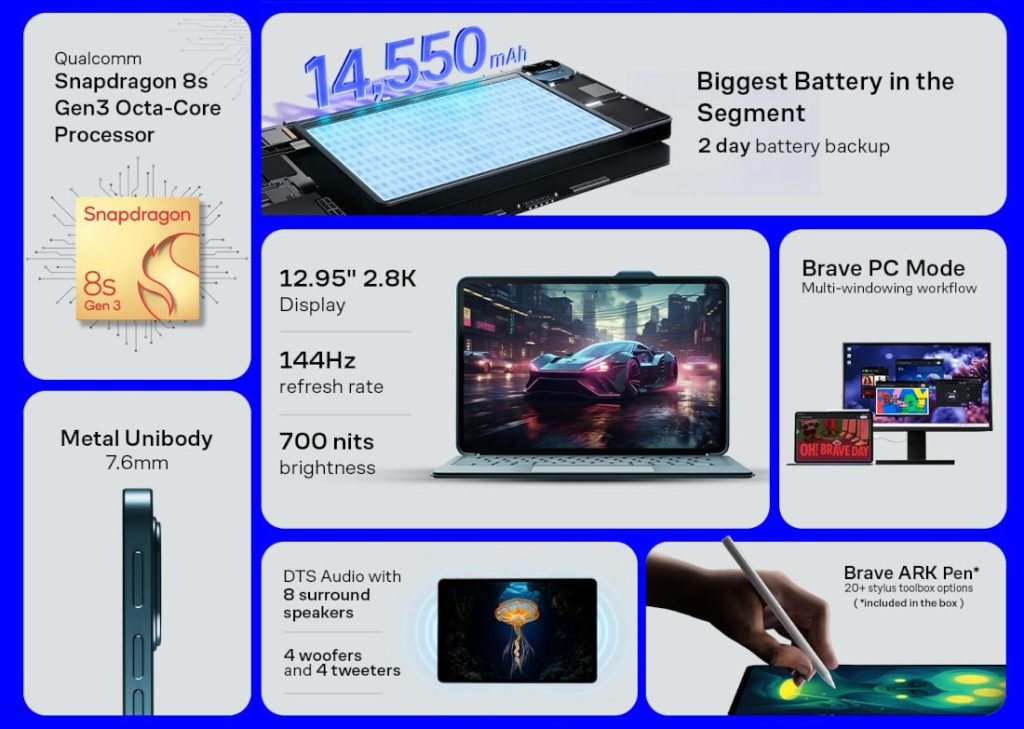 As a part of launch offers, the first 200 buyers will get a free Brave Keyboard that has backlit keys, a premium leather touch, and can magnetically reconnect to top up charge.
