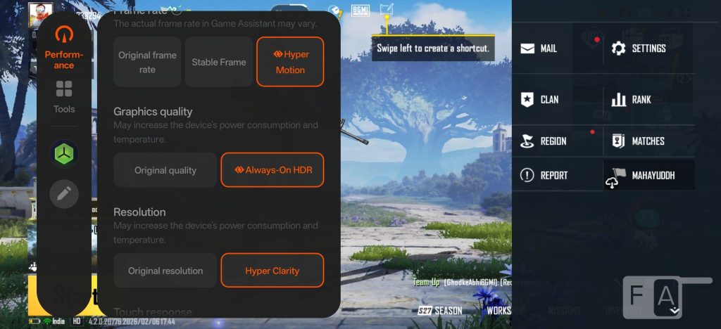 The dual-chip configuration enables stable 144FPS gameplay in popular supported titles, real-time frame generation, and resolution upscaling to 1.5K. Features attributed to the HyperVision AI chip include AI Hyper Clarity, AI Hyper Motion, and AI Always-On HDR. You can play graphic-intensive games like COD, BGMI, and Genshin Impact without any issues, and native 90 fps gaming works in BGMI.