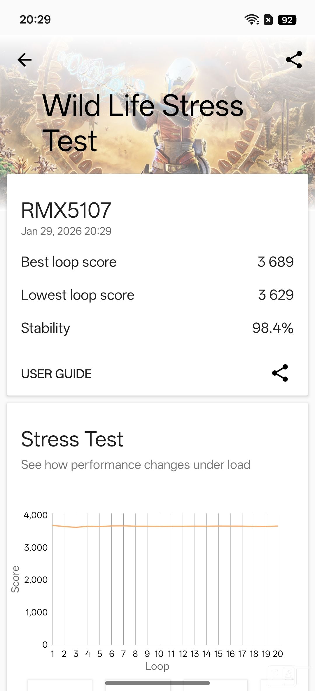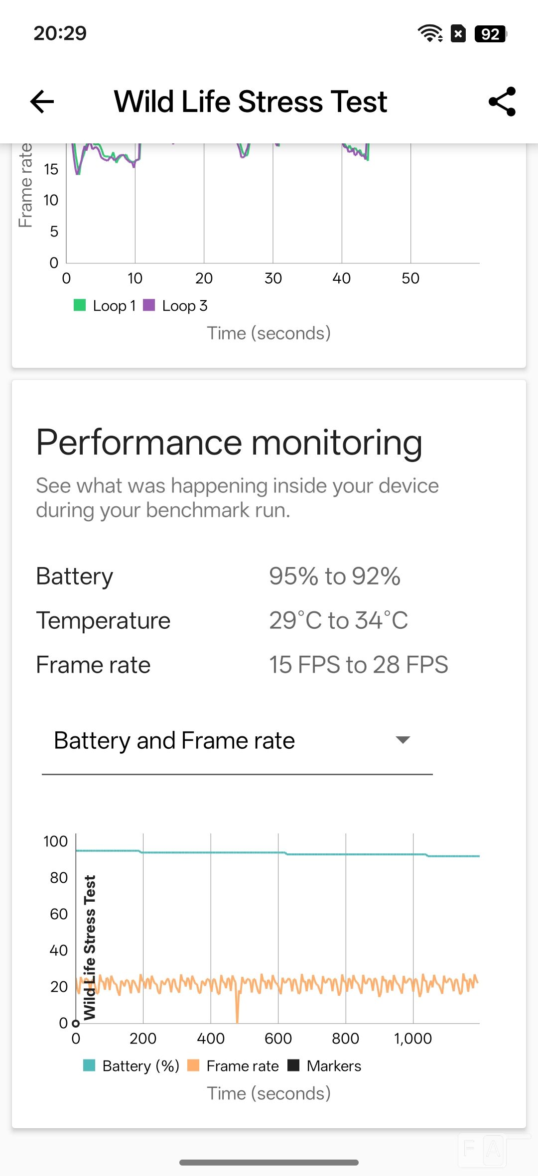 In 3D Mark wild life stress test, it scored 98.4% which is good. The temperature increased from 29 to 34 degrees, which is minimal. That said, check out some synthetic benchmark scores below.