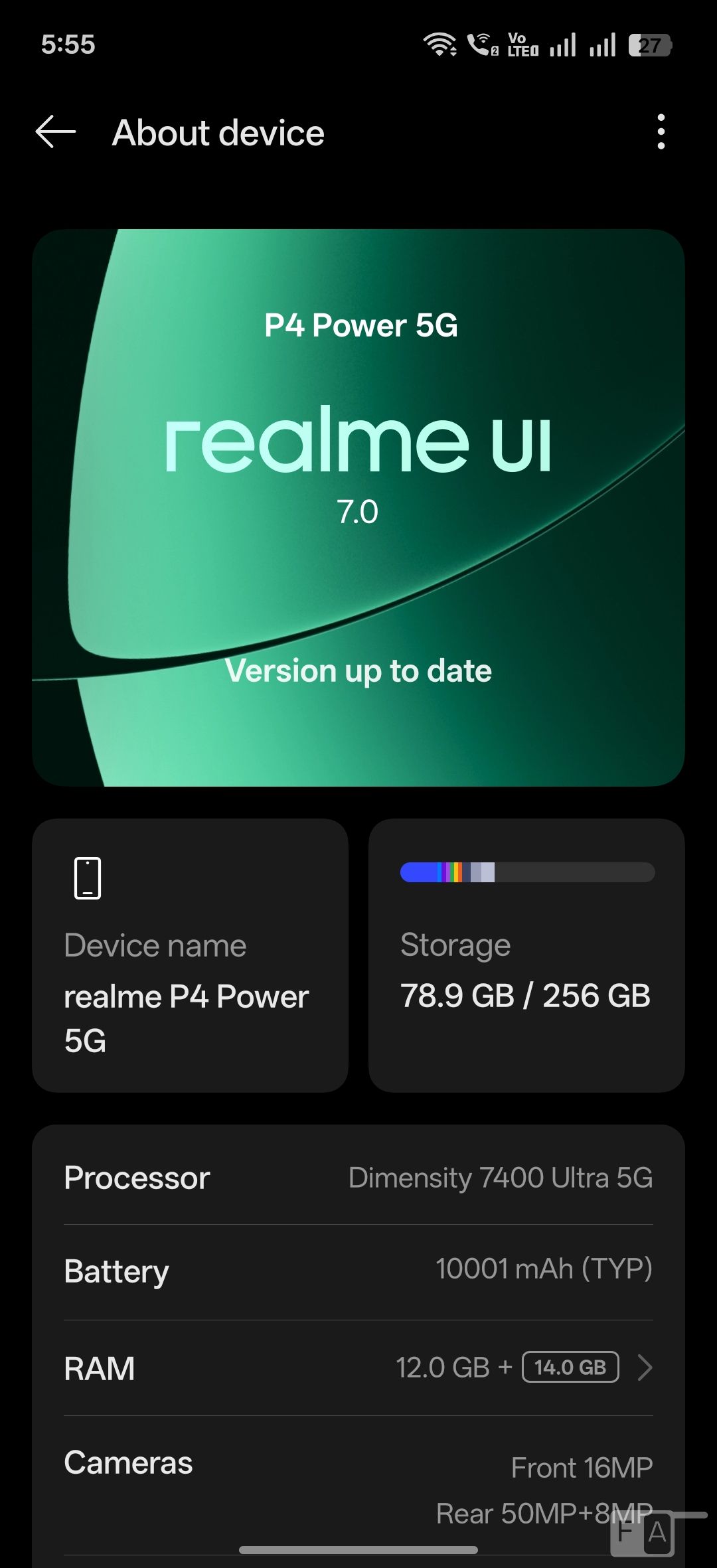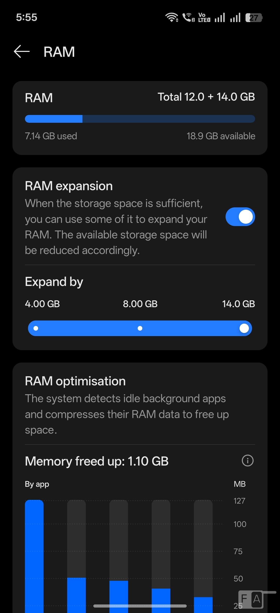 Out of 12GB LPDDR4X RAM, you get 11.19GB of usable RAM, and about 7GB of RAM is free when default apps are running in the background. It also has DRE or dynamic RAM expansion feature, which uses the built-in storage as RAM. This has up to 14GB of additional RAM expansion. Out of 256GB UFS 3.1, you get about 219.66GB of free storage.