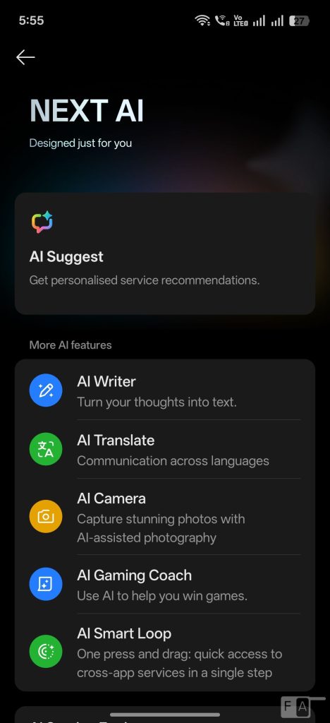 There is Light Glass Design, and adds several AI features such as AI Notify Brief, AI Framing Master, AI Gaming Coach, AI translate, AI Camera, AI Smart Loop, Flux Theme 2.0 and more. There is AI Ultra Clarity, AI Eraser, AI Glare remover, and AI Perfect Shot, and more.