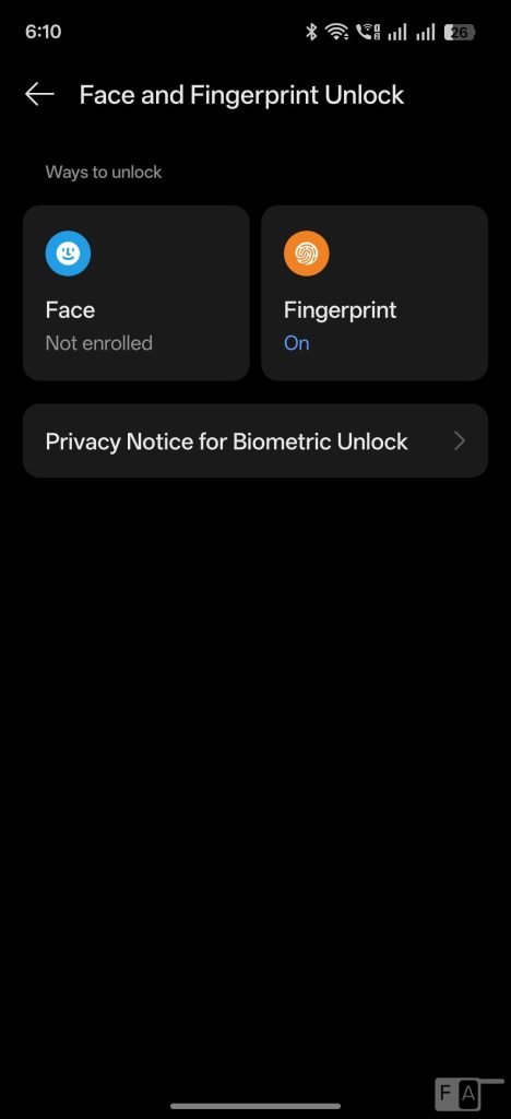 It has an in-display fingerprint sensor that unlocks the phone quickly, but it is not as fast as a physical fingerprint sensor. You can add up to 5 fingerprints. You can also use the fingerprint for app local and payments in apps. Furthermore, you can change the fingerprint animation and also disable it, and also enable quick launch option to launch apps directly from the lock screen by holding the fingerprint. The phone also has face unlock feature.