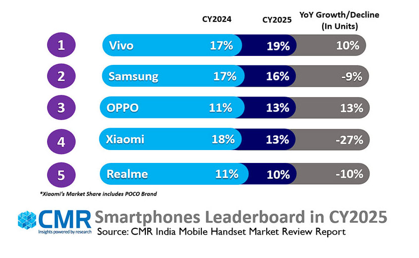 | 1 | Vivo | 19% | Market leader for CY2025. Vivo also led the 5G segment (19% share), driven by mass-market execution. The T4X, Y19, Y29, and Y39 models contributed 34% of their 5G shipments. |
