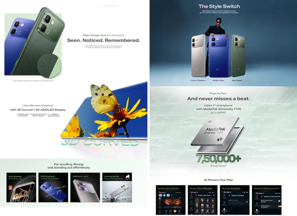 Under the hood, the Note Edge 5G is powered by the MediaTek Dimensity 7100 chipset. The marketing material claims this is the first smartphone in India to utilize this specific processor and cites an AnTuTu benchmark score of over 7,50,000.