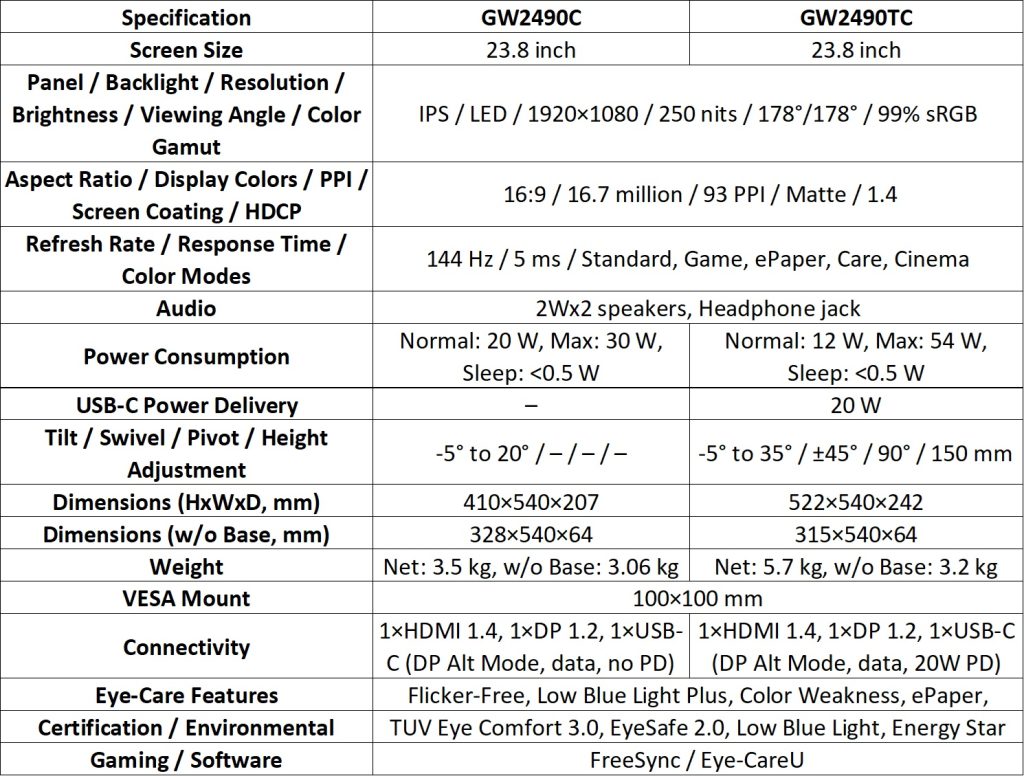 The GW90TC Series supports single-cable USB-C connections using DisplayPort Alt Mode, enabling video, data transfer, and device charging through one cable. The monitors provide up to 20W USB-C power delivery for compatible laptops and tablets.