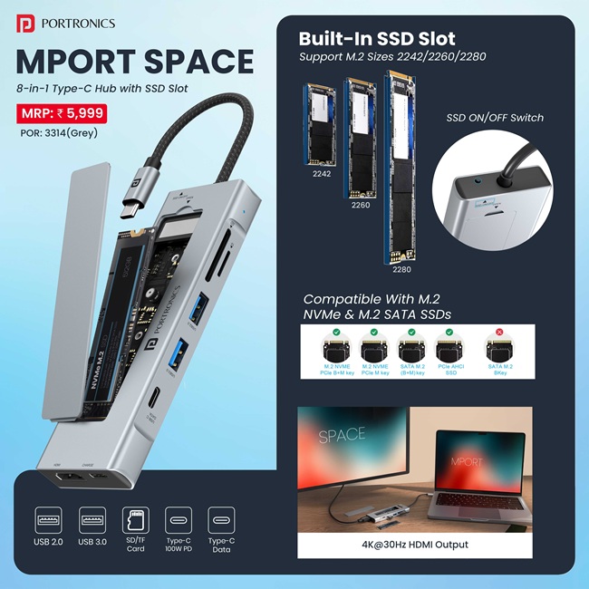 Portronics has launched the Mport Space, an 8-in-1 USB Type-C hub that integrates a built-in M.2 SSD slot with multiple connectivity ports. The hub supports NVMe and SATA SSDs in 2242, 2260, and 2280 sizes (SSD not included), allowing storage expansion without a separate enclosure.