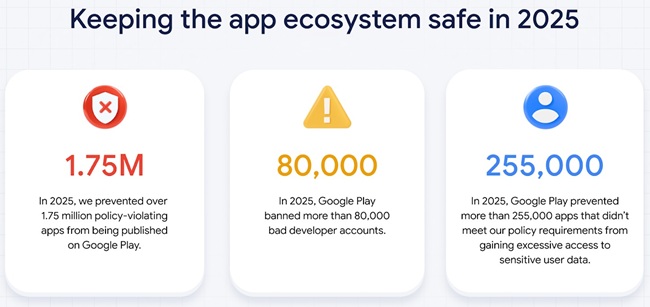 The company says it expanded AI-based review systems, strengthened real-time protections, and tightened developer verification to reduce risks before apps reach users.